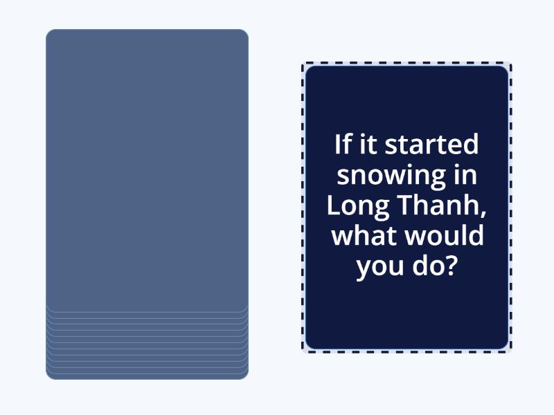 If you were a teacher, which subject would you teach? Why?, If you could live wherever you wanted, where would you live? Why?, If you were on a desert island, which item would you like to have with you? Why? , If you were preparing a special meal tonight, what would you cook? Why?, If you could do any job, what would it be? Why?, If you could change one thing about your home, what would you change? Why?, If we didn't have mobile phones, what would we do?, What would happen if the government banned fast food ?, What would happen if everyone stopped using plastic?, What would happen if Teacher Dulcie said you could go home right now?, If Sam lost his phone, what would he do?, If it started snowing in Long Thanh, what would you do?, If you're always late to class, how does the teacher feel?.