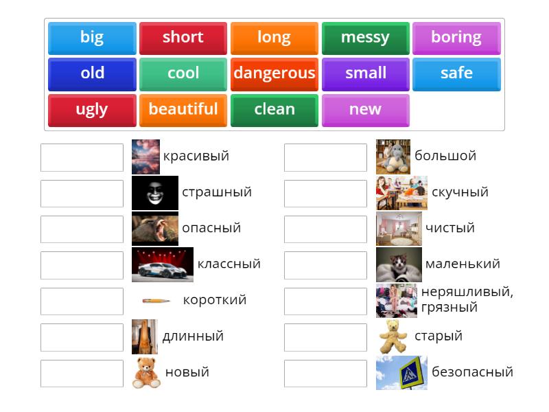 big - большой, boring - скучный, cool - классный, long - длинный, new - новый, old - старый, short - короткий, small - маленький, beautiful - красивый , ugly - страшный , dangerous - опасный, safe - безопасный , clean - чистый , messy  - неряшливый, грязный ,