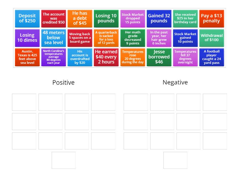 Positive : She received $25 in her birthday card, Temperatures rose 20 degrees during the day, Gained 32 pounds, Deposit of $250, Stock Market gained 10 points, A football player caught a 24 yard pass, The account was credited $50, North Carolina's temperatures average 80 degrees each year, Austin, Texas is 425 feet above sea level, He earned $40 every 2 hours, In the past year, her hair grew 6 inches, Negative: Withdrawal of $100, Stock Market dropped 15 points, Losing 10 pounds, He has a debt of $45, Pay a $13 penalty, 48 meters below sea level, Jesse borrowed $46, Temperatures fell 37 degrees overnight, Losing 10 dimes, Her math grade decreased 9 points, His account is overdrafted by $20, A quarterback is sacked for a loss of 12 yards, Moving back 5 spaces on a board game,