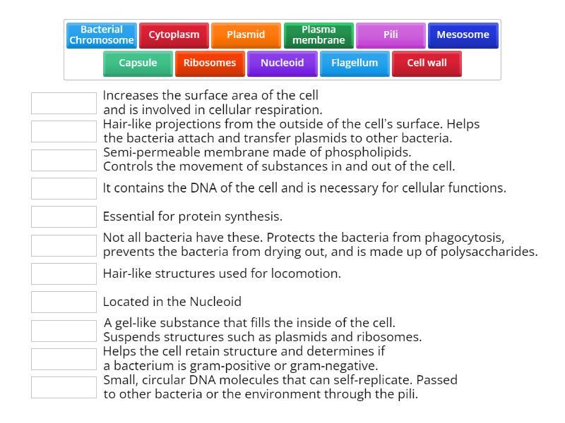 Nucleoid - It contains the DNA of the cell and is necessary for cellular functions., Capsule - Not all bacteria have these. Protects the bacteria from phagocytosis, prevents the bacteria from drying out, and is made up of polysaccharides., Flagellum - Hair-like structures used for locomotion., Bacterial Chromosome - Located in the Nucleoid, Mesosome - Increases the surface area of the cell and is involved in cellular respiration., Pili - Hair-like projections from the outside of the cell’s surface. Helps the bacteria attach and transfer plasmids to other bacteria., Plasmid - Small, circular DNA molecules that can self-replicate. Passed to other bacteria or the environment through the pili., Ribosomes - Essential for protein synthesis., Cell wall - Helps the cell retain structure and determines if a bacterium is gram-positive or gram-negative., Plasma membrane - Semi-permeable membrane made of phospholipids. Controls the movement of substances in and out of the cell., Cytoplasm - A gel-like substance that fills the inside of the cell. Suspends structures such as plasmids and ribosomes.,
