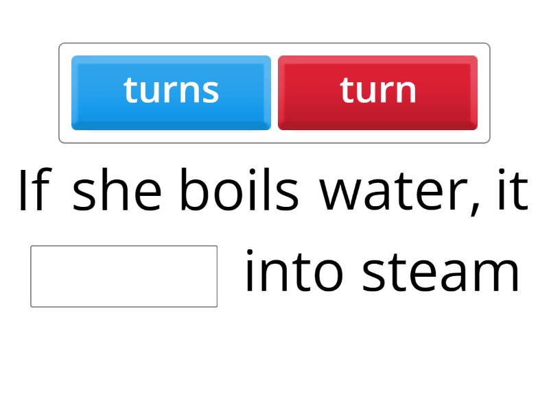 If she boils water, it ____ into steam If Paul ____ ice, it melts If you don't heat water to 100 degrees Celsius, it ____. If you do not keep the ice cream in the freezer, it ____. If you ____ water, it ____ into ice. If you ____ ice, it turns into water. If you ________ the plants, they die. If you ____, you pass the exam. If you touch ____, you ____ burned. If you ____ the power button, the computer ____. If sugar ____ in water, it ____. Babies ____ if they are tired