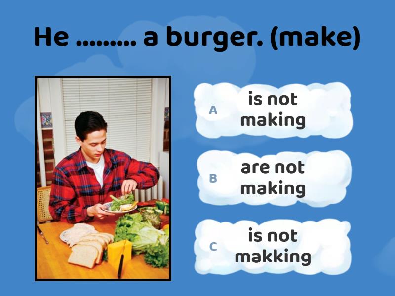 1) He ......... a burger. (make) a) is not making b) are not making c) is not makking 2) They .......... basketball (play) a) are not plaing b) are not playing c) is not playing 3) I ........... my cellphone (read) a) am not reading b) am not readyng c) are not reading 4) We ............ pizza (make) a) are not makyng b) is not making c) are not making 5) You ..... your homework (do) a) is not doing b) are not doing c) are not doying 6) Rosa and junior ................. in the pool (walk) a) is not walking b) are not walking c) are not walkying 7) My brother........ soccer (play) a) is not playing b) is not plaing c) am not playing 8) Silvia, Laura and Bianca ........... the bedroom (clean) a) are not cleaning b) are not cleanyng c) is not cleaning 9) Kimberly and Brenda......Basketball (play) a) are not plaing b) is not playing c) are not playing 10) You..... an orange (eat) a) are not eatyng b) are not eating c) is not eating 11) Olivia and her daughters .............. to the restaurant (go) a) are not going b) is not going c) are not goying 12) Valente....... a cake (make) a) are not making b) is not making c) is not makking 13) I ................. excersises (do) a) am not ding b) is not doing c) am not doing 14) Rosa.....TV (watch) a) is not watching b) am not watching c) is not watchyng 15) Jesus ..... a shower (take) a) is not taking b) are not taking c) is not takking 16) You............... french (learn) a) is not learning b) are not learning c) are not learnying 17) We ............... in the park (walk) a) are not walking b) is not walking c) are not walkking 18) It ............... outside (snow) a) am not snowing b) is not snowwing c) is not snowing 19) She ..... the guitar (play) a) is not playing b) is not plaing c) are not playing 20) Silvia ..... my house (clean) a) is not cleanyng b) are not cleaning c) is not cleaning