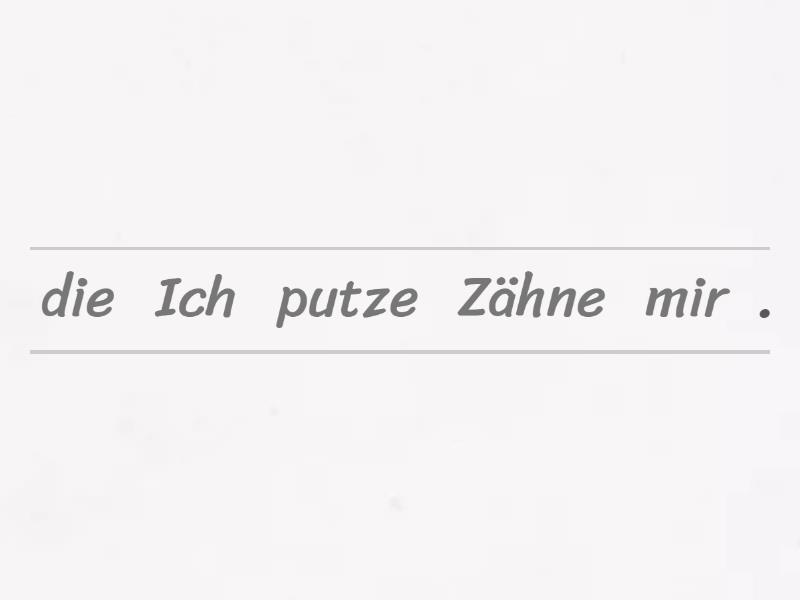 Ich putze mir die Zähne ., Trocknest du dir die Haare ?, Wir kämmen uns die Haare . , Sollen wir uns die Zähne putzen ?, Darf ich mir die Lippen schminken ?, Er wäscht sich die Hände . , Ich strecke mir die Arme ., Er rasiert sich das Gesicht . , Ich dusche mich am Abend ., Ich ziehe mich an ., Sie schminkt sich . , Ich wasche mir das Gesicht .,