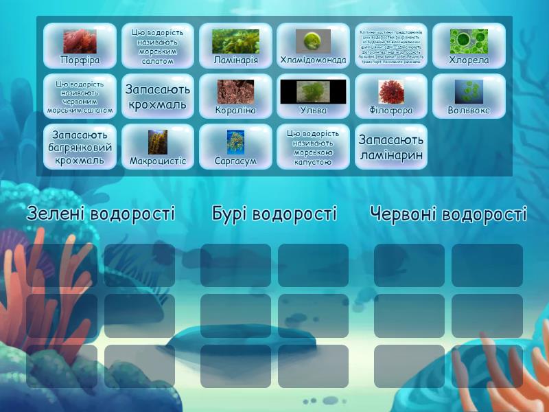 Зелені водорості: Вольвокс, Хламідомонада, Ульва, Хлорела, Запасають крохмаль, Цю водорість називають морським салатом, Бурі водорості: Запасають ламінарин, Ламінарія, Саргасум, Макроцистіс, Клітини частини представників цих водоростей розрізняють за будовою та виконуваними функціями: одні – здійснюють фотосинтез, інші – запасають поживні речовини, забезпечують транспорт поживних речовин., Цю водорість називають морською капустою, Червоні водорості: Порфіра, Кораліна, Філофора, Запасають багрянковий крохмаль, Цю водорість називають червоним морським салатом,