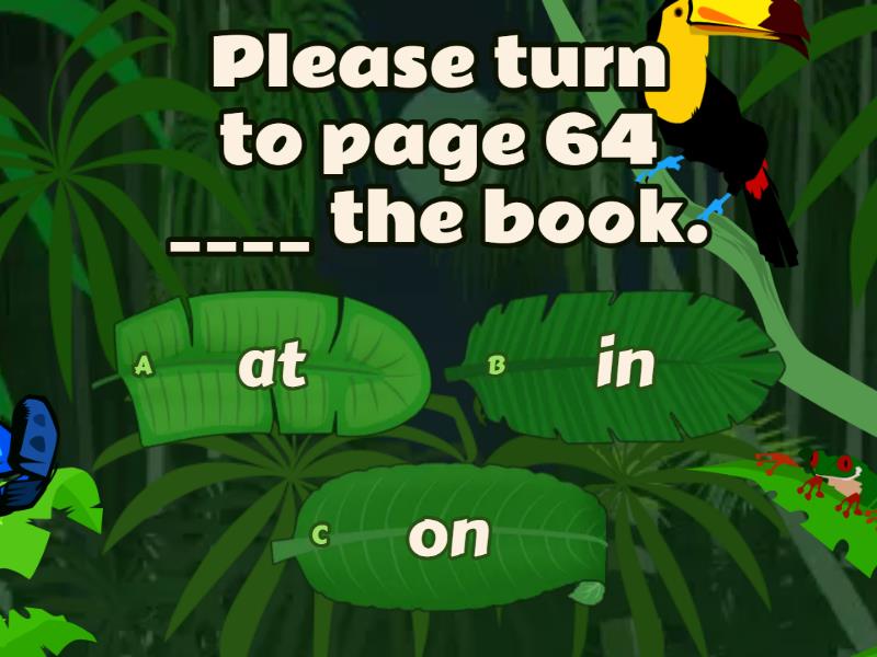 1) Please turn to page 64 ____ the book. a) at b) in c) on 2) I'm ___ HCC right now. a) at b) in c) on 3) Meet me _____ the restaurant at 6:30. a) at b) in c) on 4) I saw the funniest video ___ Tik Tok. a) at b) in c) on 5) If you drive south on Elm Street, the shop is ____ the right. a) at b) in c) on 6) The main character dies ____ the end of the book a) at b) in c) on 7) I can't help you move next week because I'll be _____ work. a) at b) in c) on 8) Please get _____ the bus a) at b) in c) on 9) There are lots of good people ____ the world. a) at b) in c) on 10) The information that you are looking for is ____ page 31. a) at b) in c) on 11) Sorry I didn't answer your text right away. I was ____ a family reunion. a) at b) in c) on 12) The police officer asked me to get _____ the car. a) at b) in c) on 13) There are many beautiful towns _____ the border of France and Switzerland. a) at b) on c) in 14) There were 160 people _____ the plane. a) at b) in c) on 15) Look! There's a really enormous and gross cockroach ____ the wall. a) at b) in c) on 16) The students sat ____ their computers and practiced prepositions. a) at b) in c) on 17) Look! They wrote about me ____ in the newspaper! a) at b) in c) on 18) Look! I'm ____ TV! a) at b) in c) on 19) McDonald's is _____ Main Street. a) at b) in c) on 20) The information you're looking for is ____ the top of the page. a) at b) in c) on 21) _____ the end of the road is a large haunted house. a) at b) in c) on