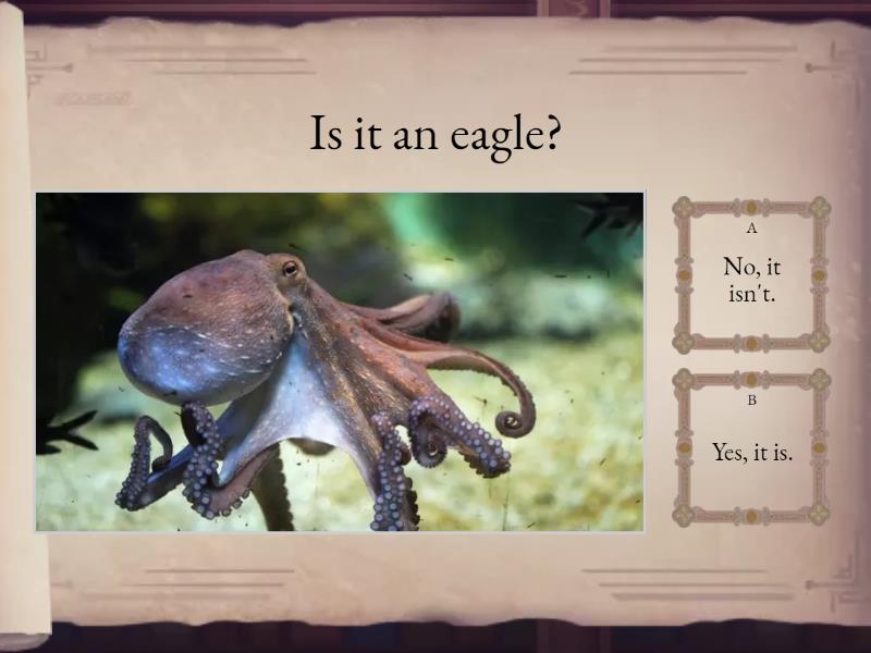 1) Is it a dolphin? a) Yes, it is. b) No, it isn't. 2) Is it a dolphin? a) Yes, it is. b) No, it isn't. 3) Is it an eagle? a) Yes, it is. b) No, it isn't. 4) Is it an eagle? a) Yes, it is. b) No, it isn't. 5) Is it a crocodile? a) Yes, it is. b) No, it isn't. 6) Is it a crocodile? a) Yes, it is. b) No, it isn't. 7) Is it an octopus? a) Yes, it is. b) No, it isn't. 8) Is it an octopus? a) Yes, it is. b) No, it isn't.
