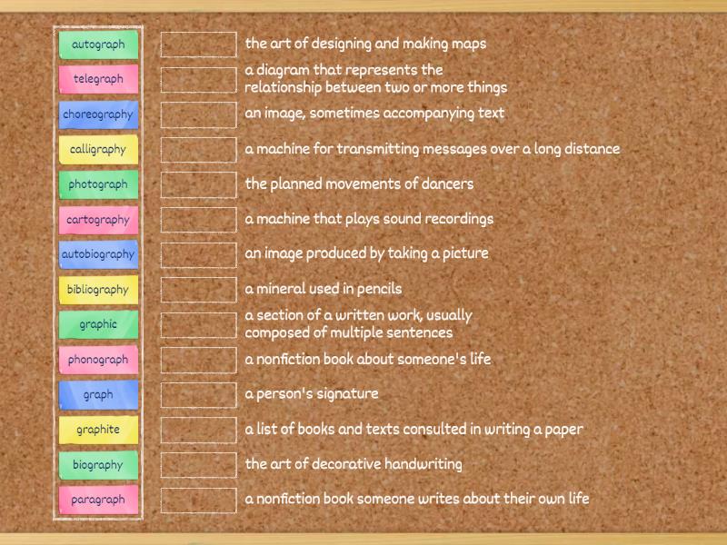 autobiography - a nonfiction book someone writes about their own life, autograph - a person's signature, bibliography - a list of books and texts consulted in writing a paper, biography - a nonfiction book about someone's life, calligraphy - the art of decorative handwriting, cartography - the art of designing and making maps, choreography - the planned movements of dancers, graph - a diagram that represents the relationship between two or more things, graphic - an image, sometimes accompanying text, graphite - a mineral used in pencils, paragraph - a section of a written work, usually composed of multiple sentences, phonograph - a machine that plays sound recordings, photograph - an image produced by taking a picture, telegraph - a machine for transmitting messages over a long distance,