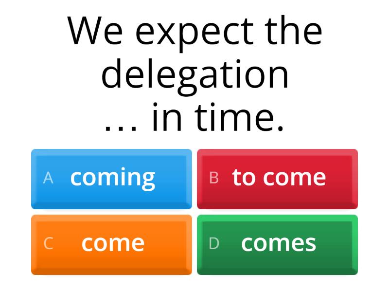 1) We expect the delegation … in time. a) coming b) to come c) come d) comes 2) Dr. Folder usually lets my son … at home when he feels sick. a) stay b) stays c) to stay d) staying 3) Everybody can see the builder … a five-storey house. a) enter b) to enter c) entering d) enters 4) The boy didn't expect the girl … him. a) to leave b) leaning c) leave d) leaves 5) Will you watch her …? a) dance b) to dance c) dancing d) dances 6) I would like my hamster ___ water. a) drink b) drinking c) drinks d) to drink