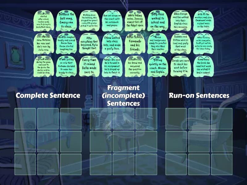 Complete Sentence: Ethan walked into class late, and made a goofy face., Ben sat down on the couch with his notebook and paper., While taking notes, Janessa almost fell off the fidget chair., Bekah raised her hand and answered the question correctly., With all the markers and glue, Emmanuel made a giant mess on the table. , It was getting so cold that Autumn decided to wear her hoody to class. , Since practice started after school, Landon made sure to bring his basketball shoes., Because the bell rang, Emery ran to class., Sarah was sure to check her work before turning it in., Fragment (incomplete) Sentences: After school, Fernando and his friends., Every time it rained Bella made sure to., Billy Rose walked to school and on the way., After everything that happened, Aylin thought that., Sitting quietly on the couch, Mason and Sophia., When Carsyn and Eve walked into their English class this morning., Bubbles and Colton were so loud and goofy that most of the class., Run-on Sentences: Neriah and Landyn were ready for practice they also liked their coaches., Adahir was sure he'd turned in his assignment he'd stayed up late to finish it., Gerardo laughed loudly and scared Aaron then Aaron started laughing too., After turning on his computer, Scott got out his notes he was ready for class today., Roma loved the book she read last week she wished it had a sequel. , Layn hurt himself during the game and went to the doctor the doctor said he would be okay., Walking down the hallway, Mia dropped her pencil a nice 6th grader picked it up for her., Can someone show Natalee her new seat she's over by Julia now.,