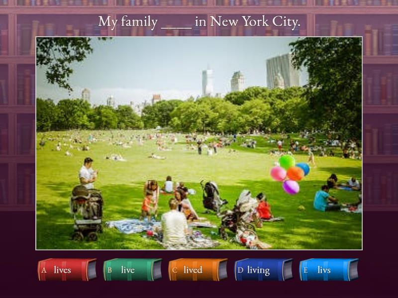 1) My family ____ in New York City. a) lives b) live c) lived d) living e) livs 2) My sister ____ very well. a) singes b) sings c) singing d) sing e) singed 3) My brothers ____ very loudly a) yelles b) yells c) yelled d) yell e) yelling 4) Everybody at the museum ______ the new dinosaur.  a) enjoying b) enjoy c) enjoys  d) enjoies e) enjoyed 5) Kate and Jane ____ their mom dig up plants in the garden. a) helps b) help c) heling d) helpes e) helped 6) Everybody ___ near the city because of job opportunities.  a) live b) lives c) lived d) living e) livs 7) A pilot and co-pilot ____ the plane. a) fly b) flies c) flyes d) flys e) flied 8) Earth ____ around the Sun. a) revolve b) revolving c) revolves d) revolved e) revolvs 9) The baby pandas at the zoo ______ just under 50 pounds. a) weight b) weighs c) weigh d) weighing e) weighed 10) Every term the students _____ new activities. a) tries b) tried c) try d) tryed e) tryes 11) The team ____ every game! a) win b) wins c) winning d) winned 12) The couple _____ together in the store. a) work b) works c) working d) worked 13) She _____ the teacher very closely. a) watch b) watched c) watchs d) watching e) watches 14) The city ____ every transaction. a) tax b) taxes c) taxs d) taxed e) taxing 15) It ____ near the flower! a) buzz b) buzzes c) buzzing d) buzzs e) buzzed 16) He ____ his hands very well. a) wash b) washes c) washed d) washing e) washs