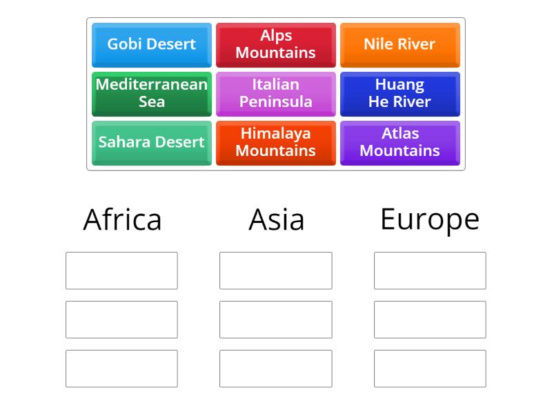 Africa: Sahara Desert, Nile River, Atlas Mountains, Asia: Gobi Desert, Huang He River, Himalaya Mountains, Europe: Italian Peninsula, Mediterranean Sea, Alps Mountains,