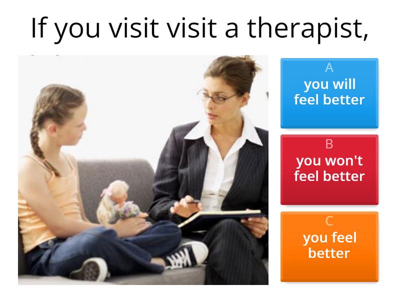 1) If you visit visit a therapist,  a) you will feel better b) you won't feel better c) you feel better 2) If you don't wear a helmet to ride a bike, a) you will be safe. b) you will hurt your head. c) you won't hurt your head. 3) If you can't sleep at night, a) you will consult with a councelor b) you will consult with a nutritionist c) you will consult with a doctor 4) If you don't exercise, a) your bones and muscles will be strong.  b) your bones and muscles won't be strong. c) you will be healthy. 5) If you do challenging activities, a) your brain will be active. b) your brain won't be active.  c) you won't have a balanced body weight. 6) If you eat healthy food, a) you won't have a balanced body weight. b) you will have a balanced body weight. c) you will consult with a nutritionist. 7) If you watch too many tiktoks, a) you will create an addiction to tiktok.  b) you will be a tiktoker.  c) you will get fat.  8) You will lose the flight.. a) if you do not sleep.  b) if you do not hurry up.  c) if you drink coffee.  9) Mom will be very angry.. a) if I cook.  b) if I help her.  c) if I don't clean my room.  10) The teacher will be happy.. a) if the children don't pay attention in the class.  b) if the children pay attention in the class.  c) if the children eat candies in the class.  11) My dad will sleep early.. a) if he doesn't drink coffee.  b) if he drinks coffee.  c) if he watches TV.  12) If I study hard, a) I will fail the test.  b) I will watch TV.  c) I will pass the test.
