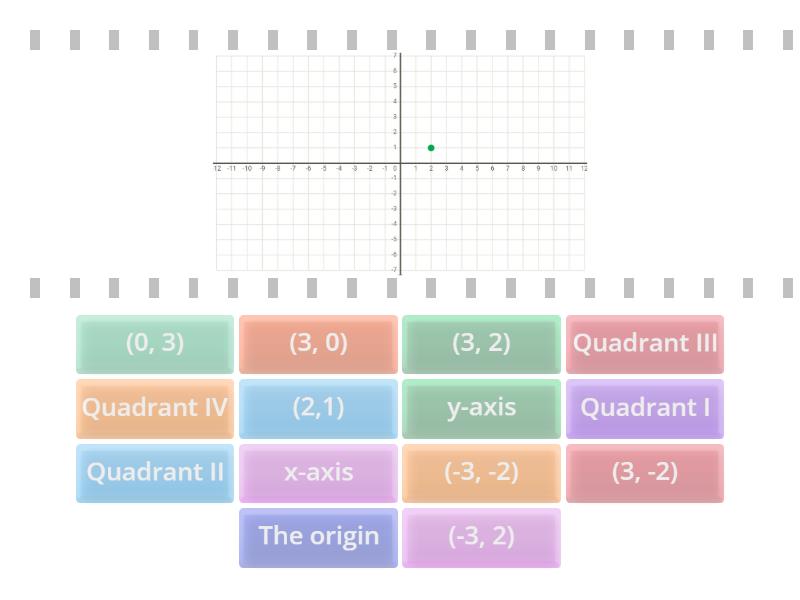 (2,1), (3, -2), (-3, -2), (3, 2), (-3, 2), The origin, (0, 3), (3, 0), Quadrant I, Quadrant II, Quadrant III, Quadrant IV, y-axis, x-axis,