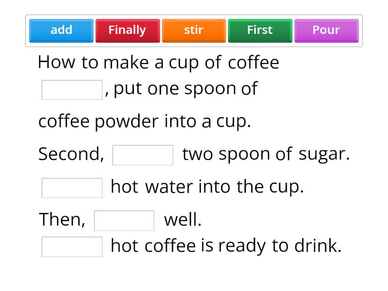 How to make a cup of coffee ____, put one spoon of coffee powder into a cup. Second, ____ two spoon of sugar. ____ hot water into the cup. Then, ____ well. ____ hot coffee is ready to drink. How to plant a seed First, ____ 3 scoops of soil in the pot. ____, please seed on top of soil. Then, ____ the seed with 1 scoop of soil. Last, ____ the seed.
