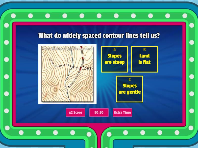 1) What do widely spaced contour lines tell us? a) Slopes are steep b) Land is flat c) Slopes are gentle 2) If there are no contour lines the land is... a) Hilly b) Flat c) Steep 3) How can you tell if a map shows a steep slope? a) The lines are far apart from each other b) The lines are close to each other 4) What is the height of this hill? a) 280m b) 318m c) 310m 5) The campsite is ... a) on a hill b) between two hills 6) Looking at the lake where is the land steeper? a) to the west of the lake b) to the east of the lake 7) What is this? a) A triangulation point on a hill b) A slope c) Flat land