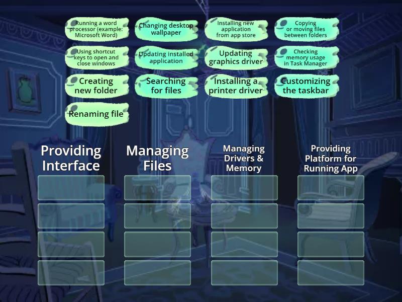 Providing Interface: Changing desktop wallpaper, Using shortcut keys to open and close windows, Customizing the taskbar, Managing Files: Creating new folder, Renaming file, Copying or moving files between folders, Searching for files, Managing Drivers & Memory: Installing a printer driver, Updating graphics driver, Checking memory usage in Task Manager, Providing Platform for Running App: Installing new application from app store, Updating installed application, Running a word processor (example: Microsoft Word),