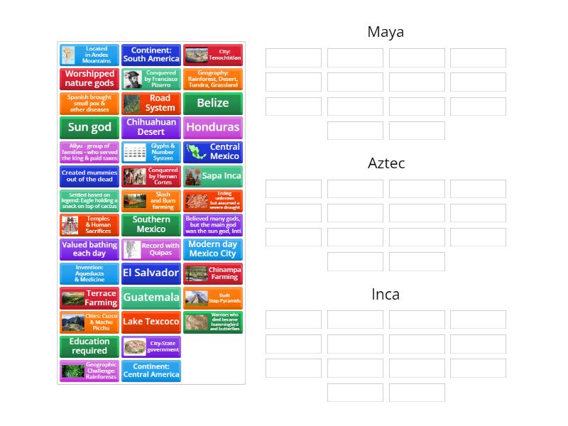 Maya: Geographic Challenge: Rainforests, City-State government, Slash and Burn farming, Built Step-Pyramids, Glyphs & Number System, Ending unknown but assumed a severe drought, El Salvador, Belize, Honduras, Guatemala, Southern Mexico, Worshipped nature gods, Valued bathing each day, Aztec: Central Mexico, City: Tenochtitlan, Continent: Central America, Education required, Chinampa Farming, Warriors who died became hummingbird and butterflies, Temples & Human Sacrifices, Conquered by Hernan Cortes, Lake Texcoco, Sun god, Chihuahuan Desert, Invention: Aqueducts & Medicine, Modern day Mexico City, Settled based on legend: Eagle holding a snack on top of cactus, Inca: Located in Andes Mountains, Cities: Cuzco & Machu Picchu, Sapa Inca, Terrace Farming, Record with Quipas, Road System, Conquered by Francisco Pizarro, Spanish brought small pox & other diseases, Geography: Rainforest, Desert, Tundra, Grassland, Continent: South America, Created mummies out of the dead, Believed many gods, but the main god was the sun god, Inti, Allyu - group of families - who served the king & paid taxes,