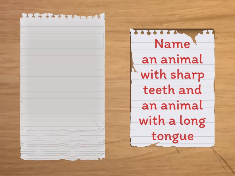 Name 3 very big animals, Name 3 very small animals, Name 2 animals that live in the sea, Name 3 animals with four legs, Name an animal with sharp teeth and an animal with a long tongue, Name 3 animals from Australia, Name 2 animals that can fly, Name 3 animals you can keep as pets, Name 2 animals that have stripes, Name 5 animals that have tails, Name two animals that sleep during the day, Name 2 animals that can’t swim, Name 3 animals that don’t have legs, Name one animal that makes you laugh!!, Name 5 animals that live in the zoo.