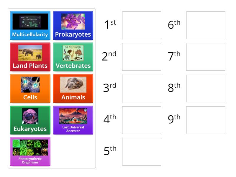 Cells, Last Universal Ancestor, Prokaryotes, Photosynthetic Organisms, Eukaryotes, Multicellularity, Animals, Vertebrates, Land Plants.