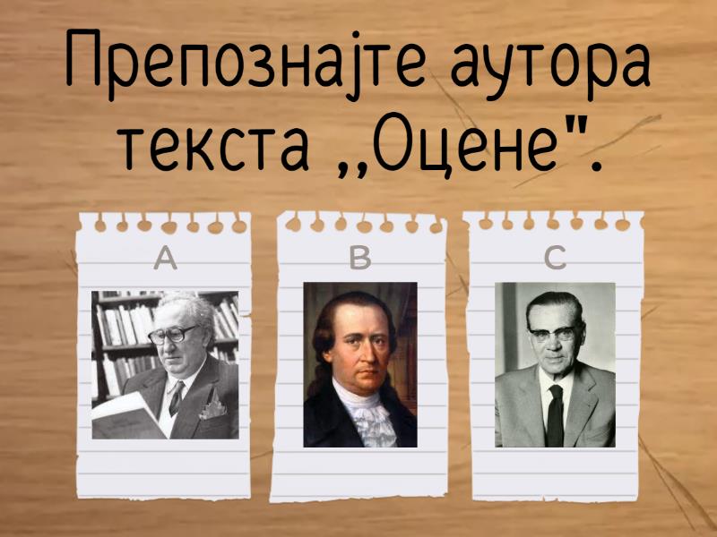 1) Препознајте аутора текста ,,Оцене". a) b) c) 2) Текст ,,Оцене" је... a) песма b) драмски текст c) прича 3) Ко је главни лик у овом тексту? a) Аца b) тетка Мица c) мама 4) Када се дешава радња овог текста? a) На тромесечју. b) На крају полугодишта. c) На крају школске године. 5) Где се дешава радња овог текста? a) На улици. b) На пијаци. c) У Ациној кући. 6) Шта ради Аца на почетку текста? a) Аца учи. b) Аца спава. c) Аца пева. 7) Аца је читао текст о... a) Доситеју Обрадовићу. b) Николи Тесли. c) Вуку Караџићу. 8) Шта Аца има из српског и из математике? a) 4 b) 2 c) 5 9) Зашто Аца није рекао истину тетки? a) Зато што се уплашио. b) Зато што га је срамота. c) Зато што је волео тетку. 10) Како се осећала Ацина мама када је сазнала за његову лаж? a) Љута је, није лепо лагати. b) Била је срећна јер нико неће сазнати какав је Аца ђак. c) Похвалила је сина и његово понашање. 11) Мама на крају каже "Црни сине, далеко ћеш ти догурати са том твојом математиком". Шта она мисли кад то каже? a) Аца ће постати познати математичар. b) Аца одлично зна математику. c) Неће добро проћи у животу ако буде наставио да лаже.