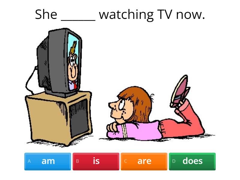 1) She ______ watching TV now. a) am b) is c) are d) does 2) It ___________ raining. a) am not b) aren't c) isn't d) is 3) They _______ sleeping at the moment. a) am b) is c) are d) isn't 4) Select the correct ING form of 'dance' a) dancing b) danceing c) danciing d) dances 5) Select the correct ING form of 'tie' a) tieying b) tieing c) tying d) ting 6) Select the correct ING form of 'play' a) plaing b) playiing c) plays d) playing 7) Select the correct ING form of 'jog' a) joging b) jogging c) jogiing d) joing 8) They _______ running. a) isn't b) am not c) aren't d) are 9) Select the correct sentence. a) Is she cry? b) Is she crying? c) She is crying now? d) She is cry? 10) Select the correct sentence. a) The dog is drinking water? b) Is the dog drink water? c) Is the dog drinking water? d) Are the dog drink water? 11) Select and Daniel ____________ the guitar. a) are playing b) is playing c) are plaing d) am playing 12) Are you cleaning your room now? a) No, I am not cleaning my room now b) Yes, I am cleaning my room now c) No, I is not cleaning my room now d) Yes, I is cleaning my room now 13) Select the correct sentence. a) My mom not is making a cake b) My mom isn't make a cake c) My mom aren't making a cake d) My mom isn't making a cake  14) What is he doing? a) He is running b) He is readiing c) He is runing d) He is sleeping 15) She is singing a) b) c) d) 16) How do you say "La estilista está cortando cabello" in English? a) The hairdresser is cutting hair. b) The hairdresser is cut hair. c) The hairdresser cutting hair. d) The hairdresser cut hair. 17) They are playing basketball a) b) c) d) 18) How do you say "El policía está trabajando" in English? a) The police officer work. b) The police officer is working. c) The police officer is work. d) The police officer working. 19) My best friend ____________ an English lesson. a) am studying b) are studying c) is study d) is studying 20) Our neighbors ________________ to the seaside by car. a) is travelling b) are traveling c) are reading d) is opening