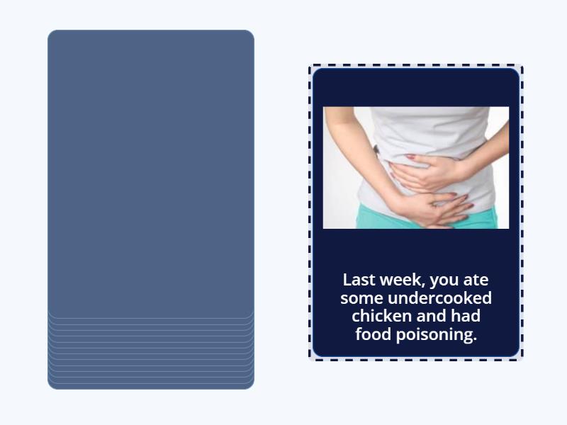 You broke your leg because you wore high heels in winter., Last week, you lost your passport at the airport and couldn't fly on holiday., Last week, you got sick because you didn't take an umbrella when it was raining outside., Last week, you found $500 on the street and bought a new mobile phone., Last week, you parked your car but didn't see the 'No parking' sign and got a parking fine (штраф)., Last week, you forgot to water your plants and they died., Last week, you had a fight and got a black eye., Last week, you were invited to a party, at the party, you met your favorite actor., Last week you failed your History test because you didn't know anything about the topic., Last week, you ate some undercooked chicken and had food poisoning., Last week, you fell asleep and forgot about your best friend's birthday., Last week, you took a bus from the city center to the airport. You were late. , You didn't understand the film, because it was in Chinese. , The jacket was beautiful but I didn't buy it, because I didn't have money :(.