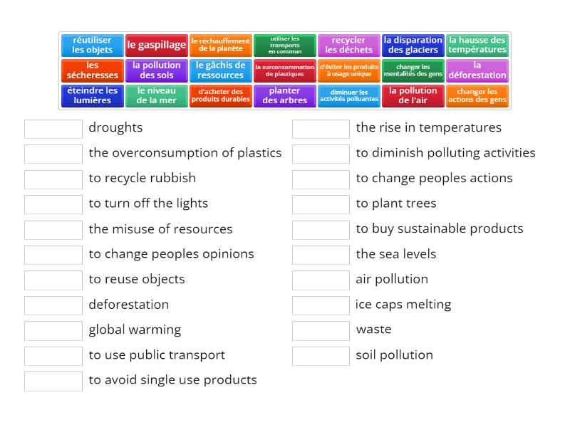 le gaspillage - waste, le niveau de la mer - the sea levels, la disparation des glaciers - ice caps melting, les sécheresses - droughts, la pollution de l'air - air pollution, la pollution des sols - soil pollution, la déforestation - deforestation, la hausse des températures - the rise in temperatures, la surconsommation de plastiques - the overconsumption of plastics, le réchauffement de la planète - global warming, le gâchis de ressources - the misuse of resources, recycler les déchets - to recycle rubbish, éteindre les lumières - to turn off the lights, réutiliser les objets - to reuse objects, diminuer les activités polluantes - to diminish polluting activities, planter des arbres - to plant trees, utiliser les transports en commun - to use public transport, d'acheter des produits durables - to buy sustainable products, d'éviter les produits à usage unique - to avoid single use products, changer les actions des gens - to change peoples actions, changer les mentalités des gens - to change peoples opinions,