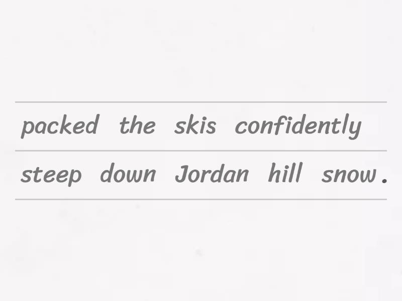Jordan skis confidently down the steep snow packed hill., The rabbit darted cautiously through the dangerous forest., The lightning flashes brightly like a neon sign in the bright sky., The child jumps like a rabbit around the room. , Meg skated with help around the ice rink., The trees reached upward with feathery branches.,
