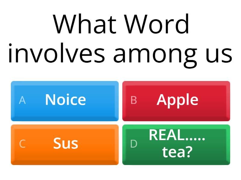 1) What Word involves among us a) Noice b) Apple c) Sus d) REAL..... tea?