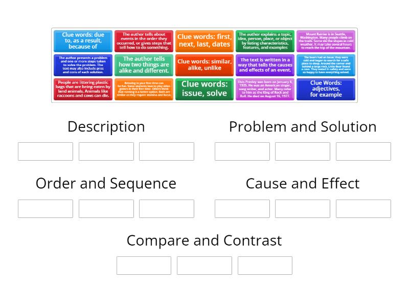 Description: The author explains a topic, idea, person, place, or object by listing characteristics, features, and examples, Clue Words: adjectives, for example, Mount Rainier is in Seattle, Washington. Many people climb on the trails. Some ski the slopes in cold weather. It may take several hours to reach the top of the mountain., Problem and Solution: The author presents a problem and one or more steps taken to solve the problem. The text may also include pros and cons of each solution., Clue words: issue, solve, The bears had an issue; they were cold and began to search for a safe place to sleep. Around the corner and behind a large rock, Little Bear found a cave. They rested in safety and were so happy to have everything solved., Order and Sequence: The author tells about events in the order they occurred, or gives steps that tell how to do something., Clue words: first, next, last, dates, Elvis Presley was born on January 8, 1935. He was an American singer, song writer, and actor. Many refer to him as the King of Rock and Roll. He died on August 16, 1977., Cause and Effect: The text is written in a way that tells the causes and effects of an event., Clue words: due to, as a result, because of, People are littering plastic bags that are being eaten by land animals. Animals like raccoons and cows can die., Compare and Contrast: The author tells how two things are alike and different., Clue words: similar, alike, unlike, Relaxing in your free time can be fun. Some students love to play video games in their free time. Others think that running is a better option. Both are similar as they require stamina and focus.,
