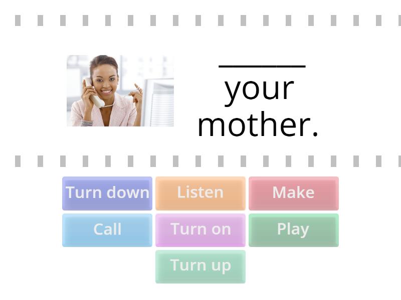 Call - ______ your mother., Make - ______ three copies., Listen - ____ to music, Play - _____ a movie., Turn on - _______ the television., Turn down - _____ the music., Turn up - _______ the lights.,
