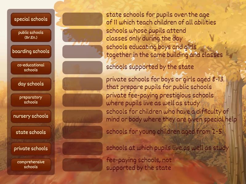 co-educational schools - schools educating boys and girls together in the same building and classes, boarding schools - schools at which pupils live as well as study, private schools - fee-paying schools, not supported by the state, comprehensive schools - state schools for pupils over the age of 11 which teach children of all abilities, special schools - schools for children who have a difficulty of mind or body where they are given special help, preparatory schools - private schools for boys or girls aged 8-13 that prepare pupils for public schools, day schools - schools whose pupils attend classes only during the day, state schools - schools supported by the state, nursery schools - schools for young children aged from 2-5, public schools (Br.En.) - private fee-paying prestigious schools where pupils live as well as study,