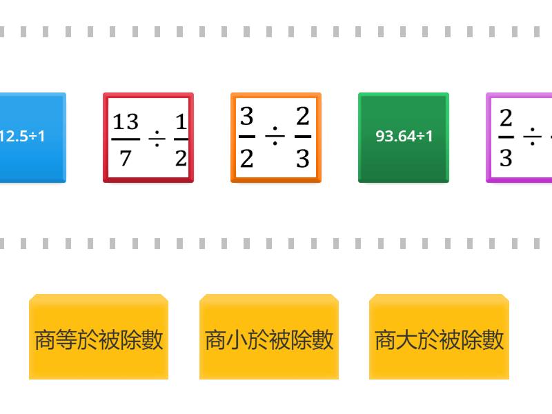 商等於被除數: , , 12.5÷1, 0.5÷1, 93.64÷1, 商小於被除數: , , , , 13.58÷5.2, 商大於被除數: , , , 52.1÷0.1, 96.34÷0.02,