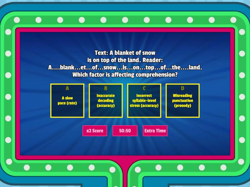 1) Text: A blanket of snow is on top of the land. Reader: A....blank...et...of...snow...is...on...top...of...the....land. Which factor is affecting comprehension? a) A slow pace (rate) b) Inaccurate decoding (accuracy) c) Incorrect syllable-level stress (accuracy) d) Misreading punctuation (prosody) 2) Text: A blanket of snow is on top of the land. Reader: A basket of snow is on top of the land. Which factor is affecting comprehension? a) Ineffective phrasing (prosody) b) Misreading punctuation (prosody) c) Incorrect word-level emphasis (prosody) d) Inaccurate decoding (accuracy) 3) Text: The GIRL is in the school! (Not someone else.) Reader: The girl is in the SCHOOL! (Not somewhere else.) Which factor is affecting comprehension? a) Incorrect word-level emphasis (prosody) b) Ineffective phrasing (prosody) c) Inaccurate decoding (accuracy) d) Incorrect syllable level stress (accuracy) 4) Text: We'll go sledding down the hill? Reader: We'll go sledding down the hill.  Which factor is affecting comprehension? a) Ineffective phrasing (prosody) b) Misreading punctuation (prosody) c) Inaccurate decoding (accuracy) d) A slow pace (rate) 5) Text: Meg and Jim get dressed to go sledding. Reader: Meg and...Jim get...dressed...to...go sledding.  Which factor is affecting comprehension? a) Inaccurate decoding (accuracy) b) A slow pace (rate) c) Ineffective phrasing (prosody) d) Misreading punctuation (prosody)
