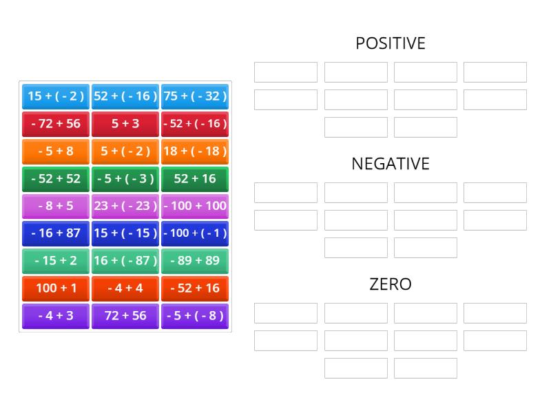 POSITIVE: 5 + 3, 5 + ( - 2 ), 15 + ( - 2 ), 75 + ( - 32 ), - 16 + 87, 72 + 56, - 5 + 8, 52 + ( - 16 ), 52 + 16, 100 + 1, NEGATIVE: - 5 + ( - 8 ), - 8 + 5, - 52 + ( - 16 ), - 52 + 16, - 4 + 3, - 72 + 56, 16 + ( - 87 ), - 15 + 2, - 5 + ( - 3 ), - 100 + ( - 1 ), ZERO: - 4 + 4, 18 + ( - 18 ), 15 + ( - 15 ), - 89 + 89, 23 + ( - 23 ), - 52 + 52, - 100 + 100,