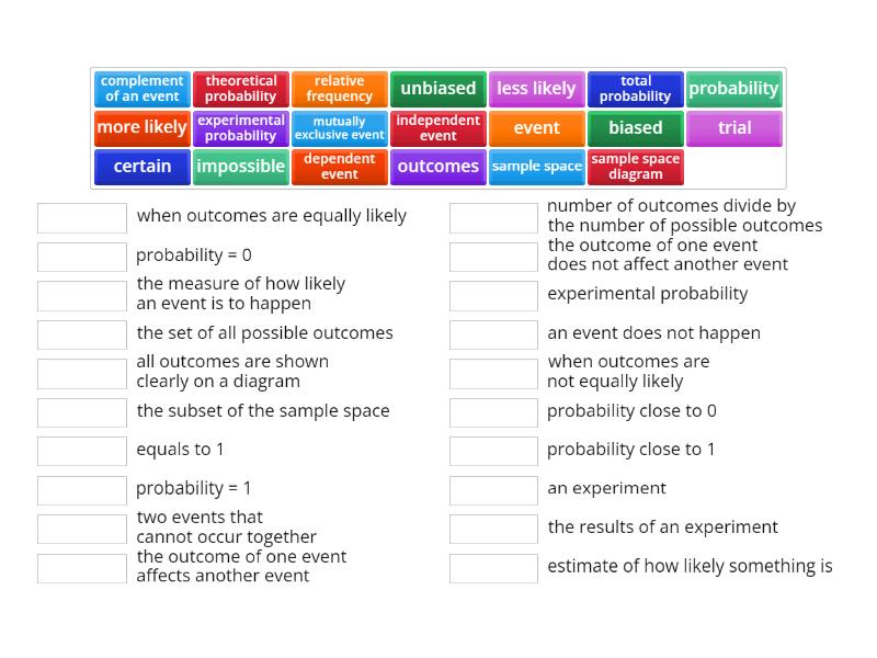 outcomes - the results of an experiment, sample space - the set of all possible outcomes, event - the subset of the sample space, probability - the measure of how likely an event is to happen, impossible - probability = 0, certain - probability = 1, less likely - probability close to 0, more likely - probability close to 1, trial - an experiment, experimental probability - estimate of how likely something is, relative frequency - experimental probability, theoretical probability - number of outcomes divide by the number of possible outcomes, biased - when outcomes are not equally likely, unbiased - when outcomes are equally likely, complement of an event - an event does not happen, sample space diagram - all outcomes are shown clearly on a diagram, independent event - the outcome of one event does not affect another event, dependent event - the outcome of one event affects another event, mutually exclusive event - two events that cannot occur together, total probability - equals to 1,