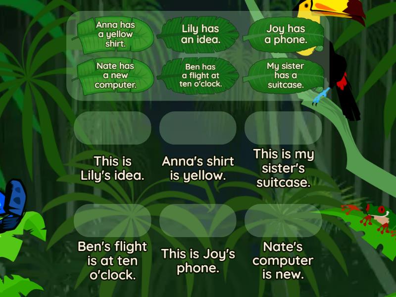 My sister has a suitcase.  - This is my sister's suitcase. , Joy has a phone. - This is Joy's phone., Anna has a yellow shirt. - Anna's shirt is yellow. , Nate has a new computer. - Nate's computer is new., Ben has a flight at ten o'clock. - Ben's flight is at ten o'clock., Lily has an idea. - This is Lily's idea.,