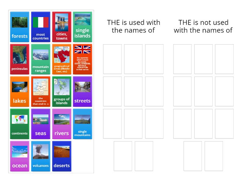 THE is used with the names of: rivers, seas, ocean, mountain ranges, groups of islands, the countries which include the words - STATES, KINGDOM, REPUBLIC, FEDERATION in their names, deserts, forests, peninsulas, geographical areas (Middle East, etc), the countries that end in -s, THE is not used with the names of: lakes, single mountains, single islands, most countries, cities, towns, streets, continents, volcanoes,