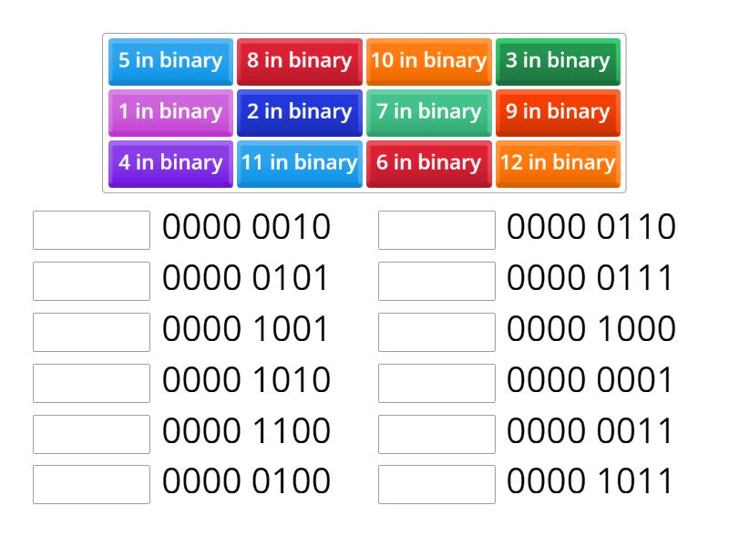 1 in binary - 0000 0001, 2 in binary - 0000 0010, 3 in binary - 0000 0011, 4 in binary - 0000 0100, 5 in binary - 0000 0101, 6 in binary - 0000 0110, 7 in binary - 0000 0111, 8 in binary - 0000 1000, 9 in binary - 0000 1001, 10 in binary - 0000 1010, 11 in binary - 0000 1011, 12 in binary - 0000 1100,