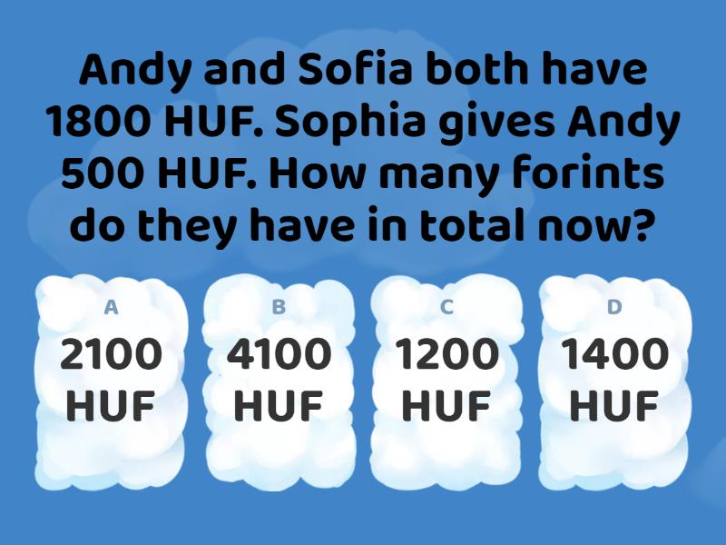 1) Andy and Sofia both have 1800 HUF. Sophia gives Andy 500 HUF. How many forints do they have in total now? a) 2100 HUF b) 4100 HUF c) 1200 HUF d) 1400 HUF 2) Andy and Sofia both have 1800 HUF. Sophia gives Andy 500 HUF. How many forints did they originally have? a) 2100 HUF b) 3000 HUF c) 3600 HUF d) 4100 HUF 3) Tom has 1000 HUF more than Grace. The two of them have 4200 HUF together. How many forints should Tom give to Grace so that they have the same amount of money?  a) 1000 HUF b) 500 HUF c) 1100 HUF d) 250 HUF 4) Tom has 1000 HUF more than Grace. They have 4200 HUF in total. How much money does Grace have?  a) 3200 HUF b) 2600 HUF c) 1600 HUF d) 4200 HUF