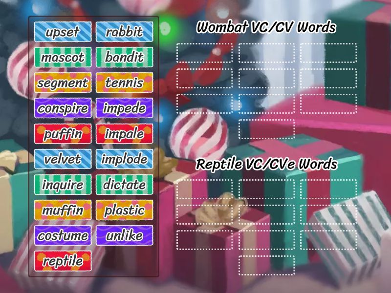 Wombat VC/CV Words: mascot, plastic, velvet, upset, muffin, puffin, bandit, segment, tennis, rabbit, Reptile VC/CVe Words: reptile, unlike, costume, dictate, inquire, impale, conspire, implode, impede,