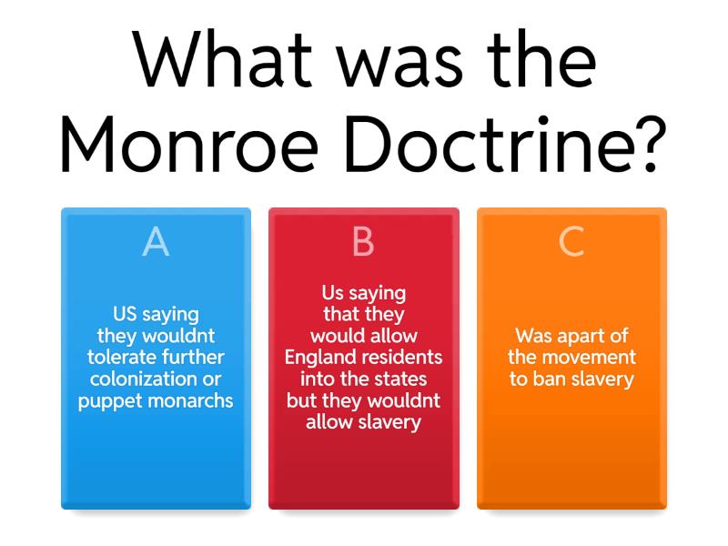 1) What was the Monroe Doctrine? a) US saying they wouldnt tolerate further colonization or puppet monarchs b) Us saying that they would allow England residents into the states but they wouldnt allow slavery c) Was apart of the movement to ban slavery 2) How was the Monroe Doctrine delivered? a) It was sent by a messenger by horse b) They delivered it across the waters with slaves c) It was sent by an annual message sent to Congress 3) Who asked James Madison for help against Spain in 1815 a) James Monroe b) Jose Juan Hernandez c) Jose Cortes d) Jose Maria Morelos 4) Did James Madison help Mexico with Spain? a) Yes b) No 5) Why did he or did he not help Mexico? a) They had been caught in an earlier war with Mexico only 20 years ago b) He saw them as inferior because of Racial Capitalism and White Supremacy c) They didn't allow slavery in the country 6) Who was Simon Bolivar? a) He was a white supremacist b) He was the first Mexican abolitionist c) Venezuelan Military Leader and Political Leader 7) Who did Simon Bolivar lead? a) Venezuela, Camden, Colombia, Ecuador, Peru, and Panama b) Colombia, Spain, Mexico, Ecuador, and Peru c) Colombia, Ecuador, Peru, Panama, Bolivia, Venezuela 8) Who was Simon Bolivar known as? a) George Washington of North America b) George Washington of South America 9) How many people came to the US every year in the beginning of the 19th Century? a) 100k b) 40k c) 60k d) 8k e) 9k f) 5k 10) What did immigration numbers skyrocket to by the 1830s a) 600k b) 650k c) 540k d) 835k 11) By 1840 how many people were coming into the US yearly? a) 2 Million b) 3.4 Million c) 1.7 Million d) 2.3 Million 12) By the 1850s how many people were coming in yearly? a) 2.6 million b) 2.8 million c) 2.1 million d) 3.6 million 13) Who were the main people coming into the states? a) Hispanic, African, British, Asian b) Irish, German, British, French c) African, British, French, Hispanic 14) Nativism a) Protecting the interest of immigrants b) Protecting the interest of native/indigenous people of a land 15) Where did most of the free African Americans live? a) North b) South c) Far South d) Far West 16) What did African Americans make where they lived? a) Money, Clothes, and Food b) They only made 20% of what White people were making c) Support Networks, Newspapers, Churches 17) When Did Frederick Bailey Escape? a) On September 2nd 1838 b) On September 3rd 1838 c) On November 3rd 1838 d) On November 2nd 1838 18) Who is Frederick Bailey now remembered now? a) Frederick Bart b) Frederick Lyscowickz c) Frederick Douglass 19) Who did Frederick Douglass become? a) He became a writer and minister b) He became a part time construction worker an he worked in the Underground Railroad c) He became a preacher and teacher d) He became a preacher and abolitionist 20) When did Nat Turners Rebellion happen? a) August 22 1831 b) June 23rd 1832 c) July 22 1831