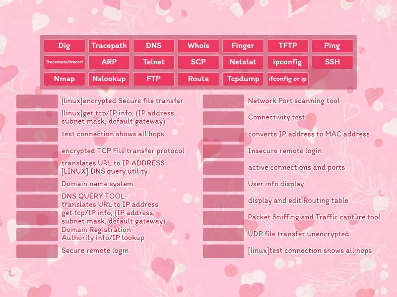 Ping - Connectivity test, ipconfig - get tcp/IP info, (IP address, subnet mask, default gateway), ifconfig or ip - [linux]get tcp/IP info, (IP address, subnet mask, default gateway), Traceroute/tracert - test connection shows all hops, Tracepath - [linux]test connection shows all hops, ARP - converts IP address to MAC address, Netstat - active connections and ports, Nslookup - DNS QUERY TOOL translates URL to IP address , Dig - translates URL to IP ADDRESS [LINUX] DNS query utility, Whois - Domain Registration Authority info/IP lookup, Route - display and edit Routing table, SCP - [linux]encrypted Secure file transfer, FTP - encrypted TCP File transfer protocol, TFTP - UDP file transfer unencrypted, Finger - User info display, Nmap - Network Port scanning tool, Tcpdump - Packet Sniffing and Traffic capture tool, Telnet - Insecure remote login, SSH - Secure remote login, DNS - Domain name system,