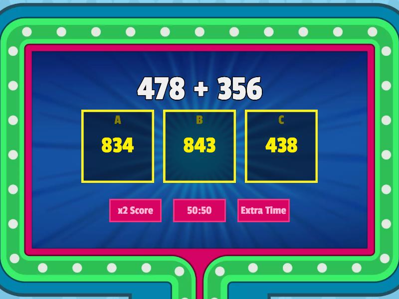 1) 478 + 356 a) 834 b) 843 c) 438 2) 136 + 173 a) 903 b) 309 c) 37 3) 387 + 47 a) 443 b) 240 c) 434 4) 665 - 258 a) 923 b) 723 c) 407 5) 455 + 256 a) 199 b) 711 c) 668 6) 728 + 107 a) 935 b) 625 c) 835 7) 489 + 149 a) 340 b) 638 c) 345 8) 278 + 344 a) 66 b) 601 c) 622 9) 148 + 362 a) 510 b) 214 c) 320 10) 147 + 65 a) 82 b) 212 c) 300