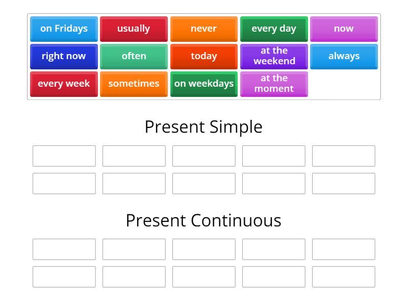 Present Simple: every day, every week, on Fridays, on weekdays, at the weekend, always, never, usually, often, sometimes, Present Continuous: now, right now, at the moment, today,