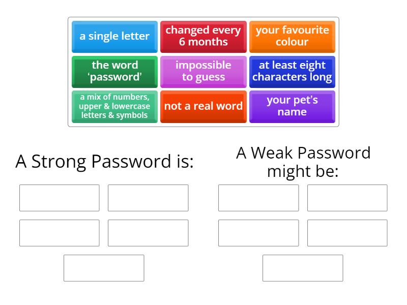 A Strong Password is:: at least eight characters long, a mix of numbers, upper & lowercase letters & symbols, not a real word, impossible to guess, changed every 6 months, A Weak Password might be:: the word ‘password’, your favourite colour, your pet’s name, a single letter,