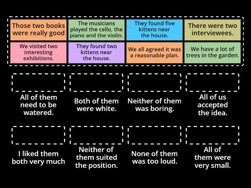 Those two books were really good - I liked them both very much, We visited two interesting exhibitions. - Neither of them was boring., We all agreed it was a reasonable plan. - All of us accepted the idea., They found two kittens near the house. - Both of them were white., They found five kittens near the house. - All of them were very small., The musicians played the cello, the piano and the violin. - None of them was too loud. , We have a lot of trees in the garden. - All of them need to be watered., There were two interviewees. - Neither of them suited the position. ,