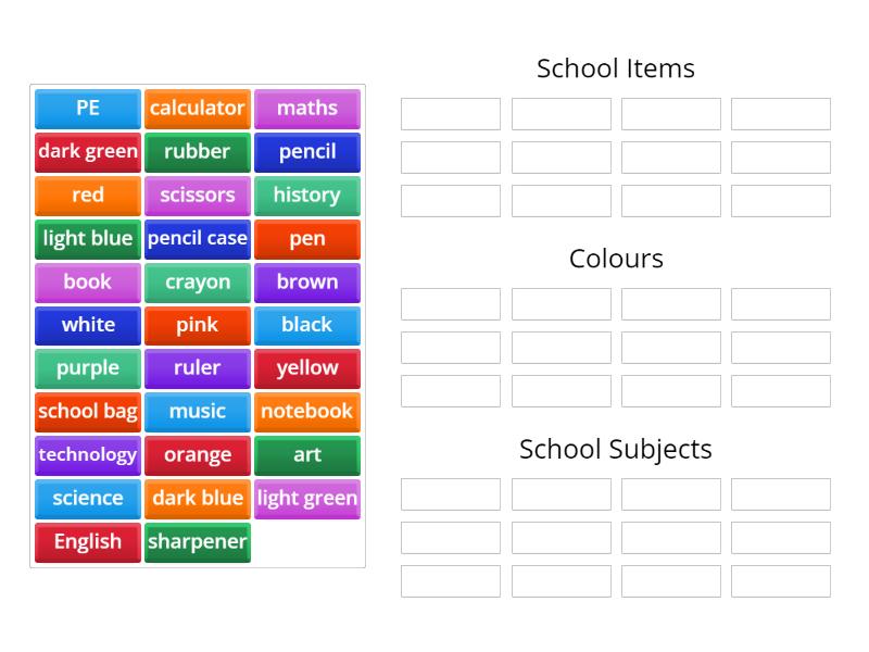 School Items: book, calculator, crayon, notebook, pen, pencil, pencil case, rubber, ruler, school bag, scissors, sharpener, Colours: red, orange, yellow, light green, dark green, light blue, dark blue, purple, black, white, brown, pink, School Subjects: art, English, history, maths, music, PE, science, technology,