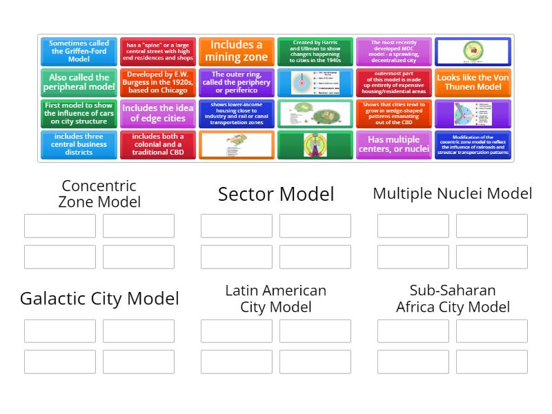 Concentric Zone Model: Looks like the Von Thunen Model, , Developed by E.W. Burgess in the 1920s, based on Chicago, outermost part of this model is made up entirely of expensive housing/residential areas, Sector Model: Modification of the cocentric zone model to reflect the influence of railroads and streetcar transportation patterns , , Shows that cities tend to grow in wedge-shaped patterns emanating out of the CBD, shows lower-income housing close to industry and rail or canal transportation zones , Multiple Nuclei Model: , First model to show the influence of cars on city structure, Created by Harris and Ullman to show changes happening to cities in the 1940s, Has multiple centers, or nuclei, Galactic City Model: Includes the idea of edge cities, Also called the peripheral model, , The most recently developed MDC model - a sprawling, decentralized city, Latin American City Model: Sometimes called the Griffen-Ford Model, has a "spine" or a large central street with high end residences and shops, The outer ring, called the periphery or periferico , , Sub-Saharan Africa City Model: includes three central business districts, includes both a colonial and a traditional CBD, , Includes a mining zone,