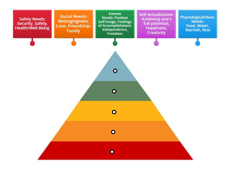 Physiological/Basic Needs: Food, Water, Warmth, Rest, Safety Needs: Security, Safety, Health/Well-Being, Social Needs: Belongingness, Love, Friendship, Family, Esteem Needs: Positive Self Image, Feelings of Accomplishment, Independence, Freedom, Self-Actualization: Achieving one's full potential, Happiness, Creativity.